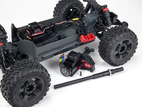 The BIG ROCK™ 4X4 3S BLX is DESIGNED FAST, DESIGNED TOUGH — built for exciting bashing speeds and extreme, all-terrain durability. New features that enhance its unstoppable performance include a stronger chassis and retained hinge pin plates; steering with more clearance for stones; a castellated slipper pad and sliding gear mesh; longer suspension arms for a 1.10 inch increase in width; and rubber-shielded bearings throughout.